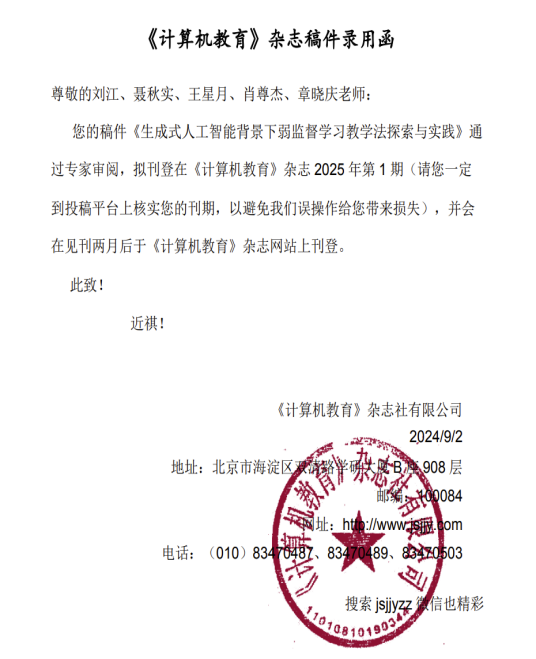 刘江老师在《计算机教育》期刊上发表“生成式人工智能背景下的弱监督学习教学法探索与实践”论文并正式提出的教育智能定义