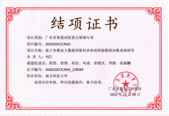 南科大计算机系刘江老师主持的广东省教育厅项目,项目名为“基于多模态大数据的眼科多疾病智能精准诊断系统研究”,近日收到省教育厅下达的结题证书,顺利结题,可喜可贺!